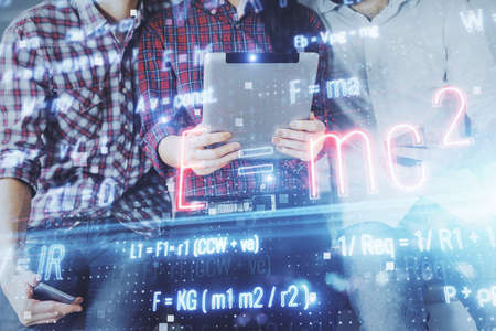 Double exposure of formulas hologram drawing and man and woman working together holding and using a mobile device. Education concept