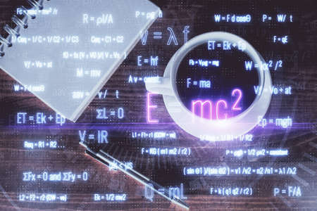 Double exposure of formula drawing and desktop with coffee and items on table