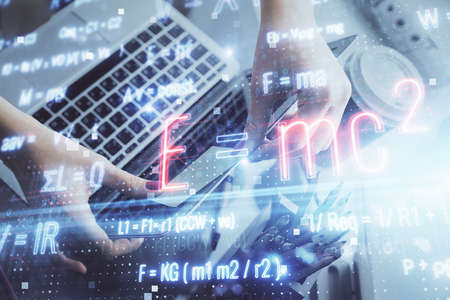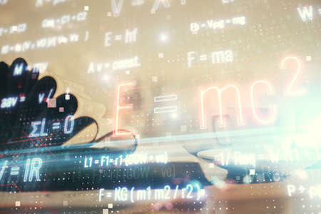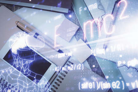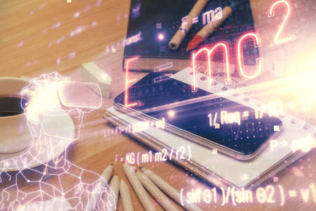 Double exposure of tech formula drawing and work table top veiw. concept of education.
