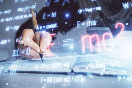 Science formula hologram over woman's hands taking notes background. Concept of study. Double exposure