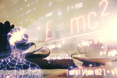Desktop computer background and formula hologram writing. Double exposure. Education concept.