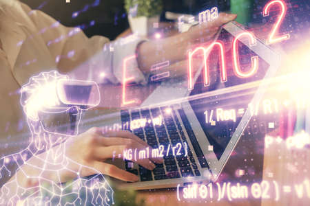 Double exposure of woman hands typing on computer and formula hologram drawing. Education concept.