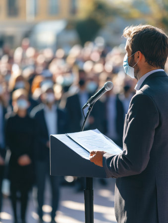 Confident Male Politician Speaking at an Outdoor Rally with a Diverse Audience. Male speaker addressing crowd at an event