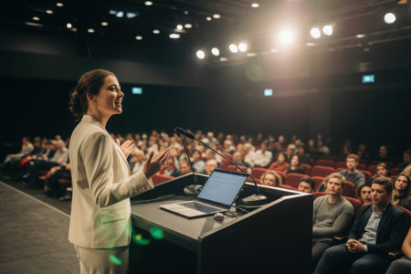 A woman in a suit speaks at a podium before an audience. Bright stage lighting illuminates her and the crowd. The background features a vibrant graphic with motivational text. This image is suitable for illustrating business, leadership, or motivational concepts for commercial purposes.