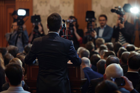 Male Speaker at Podium Facing a Crowd of Journalists and Cameras.