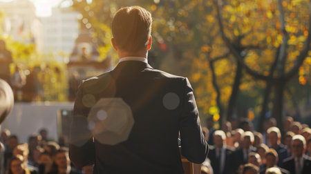 A speaker stands before a captivated audience in an outdoor setting, delivering an engaging speech, while sunlight illuminates the gathering.