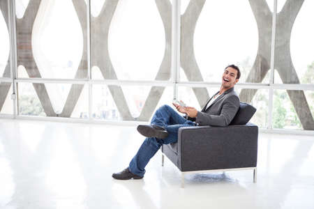 Attractive business man in his 20s working on a mini think pad in a wide open space