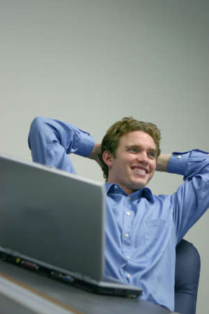 Young relaxed business man with hands behind head at work
