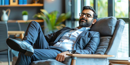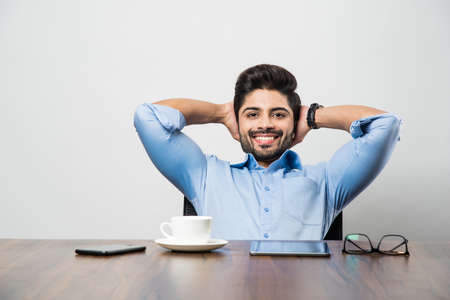 Handsome Indian business man relaxing in armchair in office.