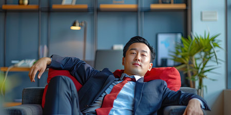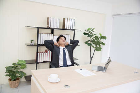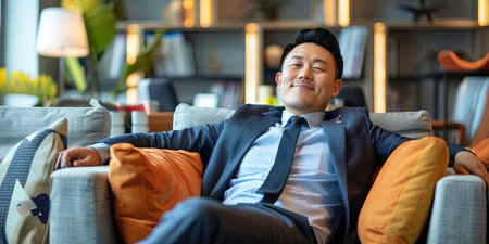 Portrait of Asian businessman relaxing on sofa in office. Business concept