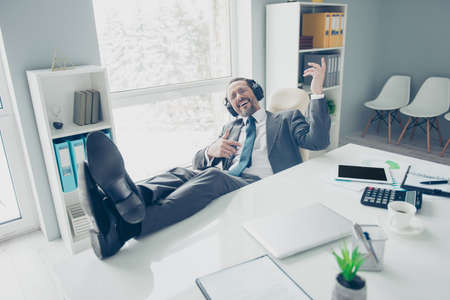Portrait of young, happy, smiling lawyer, closing his eyes, listening favorite music in headphones, showing that he is playing guitar, puts his legs on the table while sitting at his desktop