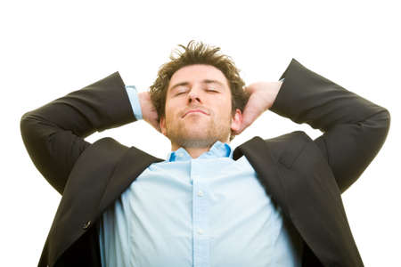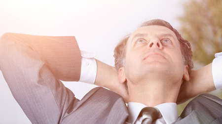 A businessman holding hands behind his head fingers crossed, relaxing after hard work.