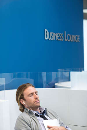 Businessman listening to earphones