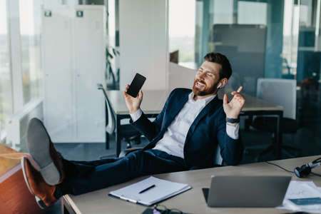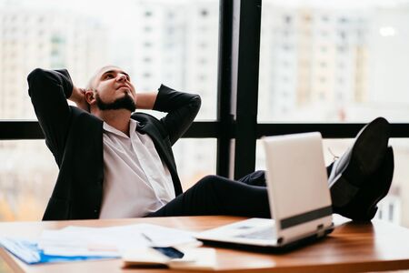 Satisfied businessman celebrates success. The man sits with his feet on the table.
