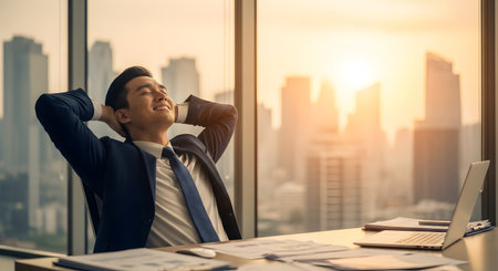 A successful Asian businessman in a suit smiles and relaxes in his high-rise office, leaning back with his hands behind his head. His desk has a laptop and papers, and the large window behind him shows a stunning sunset view of a modern city skyline.