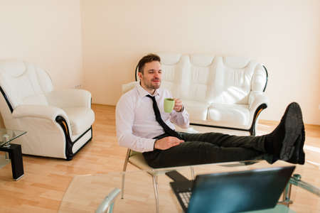 Businessman relaxes sitting in the office and looking in window