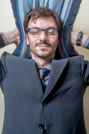 businessman sleeping on pillow on gray background
