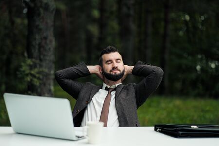 Young attractive male businessman in suit sitting at desk in forest of nature park. Stretches and rests from work. Laptop and cup of coffee on table.