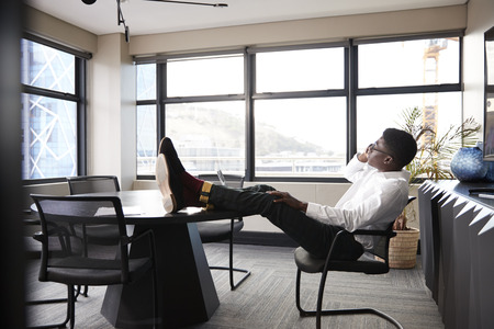 Portrait of contemporary African-American businessman relaxing at workplace in office with feet on desk, copy space