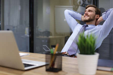 portrait of a young businessman is sitting in his office having a break while working with the computer and holding his hands behind his head