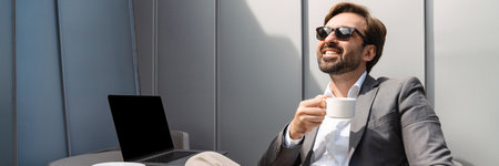 Adult Caucasian businessman dress in smart formal suit sitting inside modern office space drinking coffee while waiting and planning for business meeting. Entrepreneur concept with copy space.