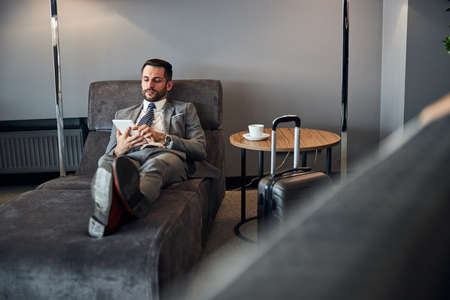Business executive swiping over the screen while seeking information during a break on a couch