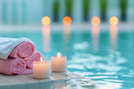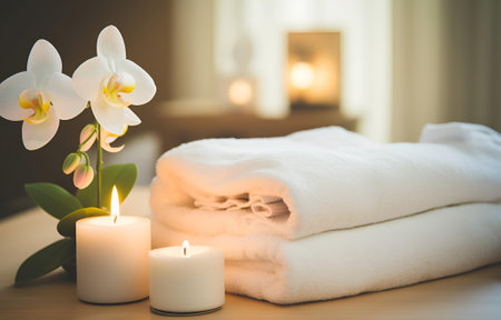 Spa and wellness setting with white towels, candles, flowers and essential oil