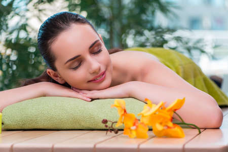 Beautiful, young and healthy woman in spa salon on bamboo mat. Spa, health and healing concept.