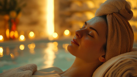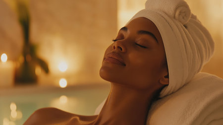 Woman with perfect skin and towel on head relaxing at spa, skin care