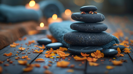 A serene spa composition featuring stacked Zen stones, warm candlelight, and scattered orange petals on a wooden surface