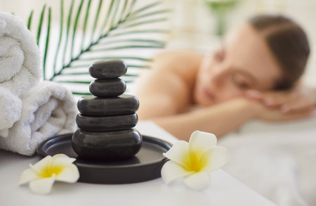 Portrait of a pretty young relaxed woman with closed eyes lying alone relaxing in modern spa salon with massage stones, towel and flowers in foreground. Wellness and beauty day concept.