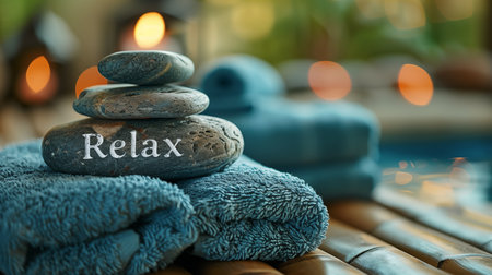 Spa-still life on a brown wooden background with a towel massage stones and aromatic oil and a burning candle.