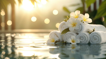 Two gray hand towels in wicker basket on poolside in hotel spa. Pink frangipani flower as decoration. Beauty treatment.