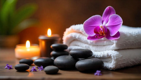 Spa ambiance: white orchids, stones, towel and candle arrangement