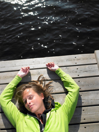 Young woman relaxing on pier. laying on the pier and watching in the sky. listening some music