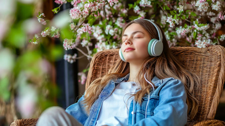 mixed race woman girl is sitting lying on couch at home with her eyes closed with headphones. teen student listens to music. person is resting