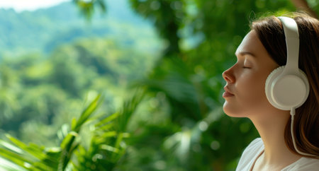 A beautiful 35-year-old woman listens to music with large headphones. Close-up. Harmony, relaxation and relaxation.
