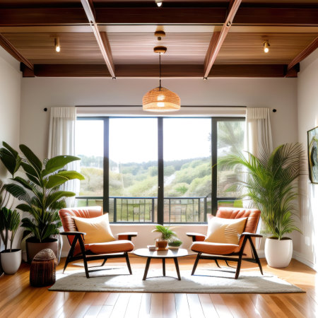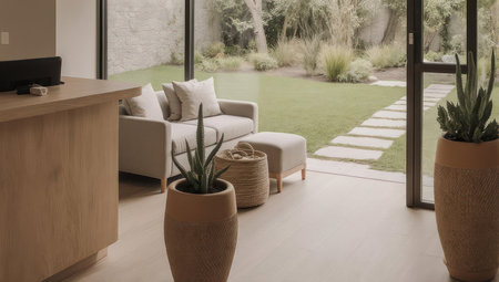 Indoor view showcasing a modern living space with outdoor garden vista, featuring plants, and furniture