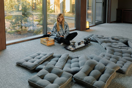 Woman is sitting on the floor surrounded by soft cushions. She is preparing for a tea ceremony with a wooden box and teapot in bright room.