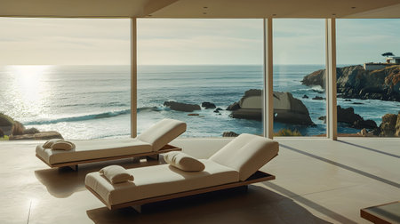A minimalist lounge area boasts sleek, modern chaise longues, vast glass facades revealing a breathtaking cliff-side ocean view Soft sunlight gleams off the waves, casting a soothing light on the