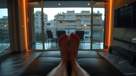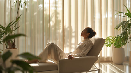 A woman peacefully relaxes on a modern daybed in a sun-drenched, minimalist living room. Sunlight streams through a large window that offers a serene view of water and hills. The tranquil scene embodies concepts of mindfulness, self-care, and finding peace at home.
