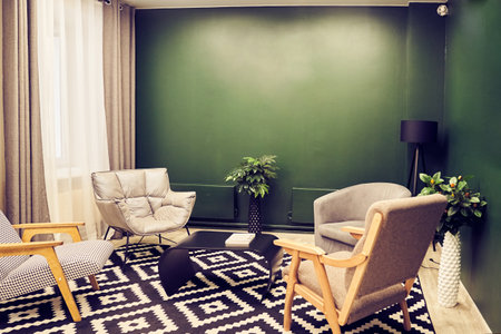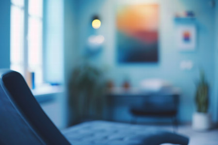 Blurred interior of a cozy therapy room with calming decor