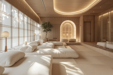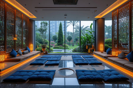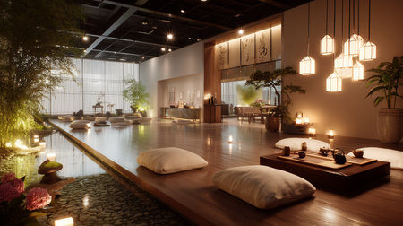 Tranquil tea room with soft lighting and serene water features in modern design