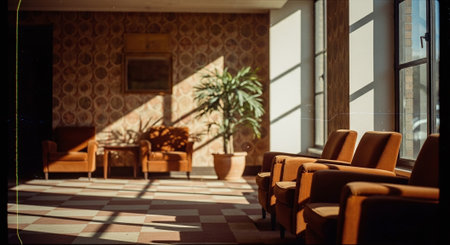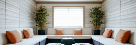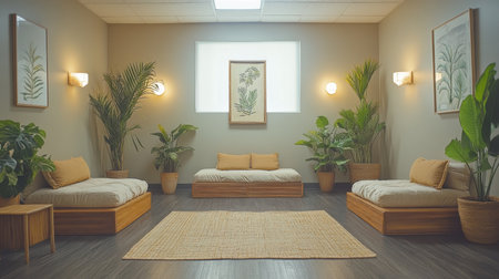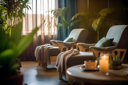 Cozy and serene interior lounge area filled with greenery and natural light, featuring comfortable seating and calming decor. Generative AI