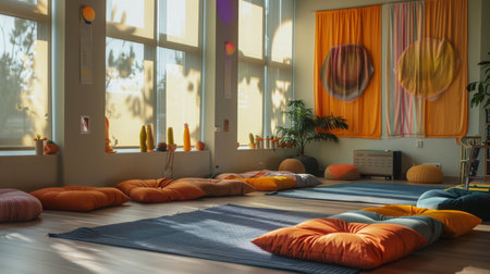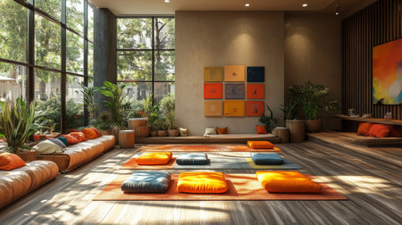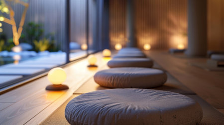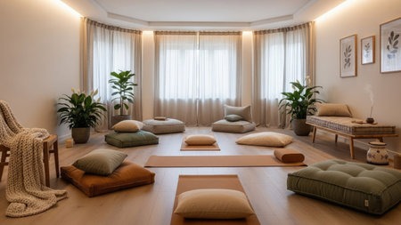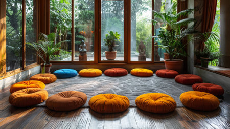 meditation circle, mindfulness and mental well-being promoted through circle of meditation cushions at tranquil wellness retreat
