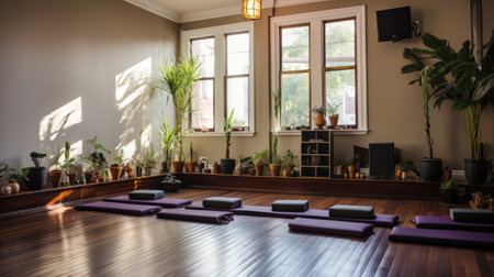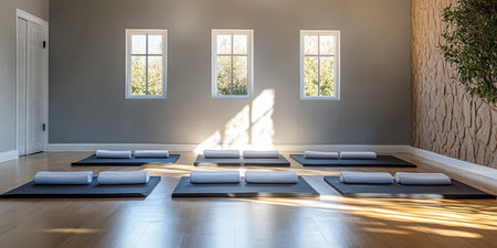 A yoga studio featuring multiple mats neatly arranged with rolled towels illuminated by soft morning light coming through large windows. The peaceful atmosphere invites relaxation and practice.