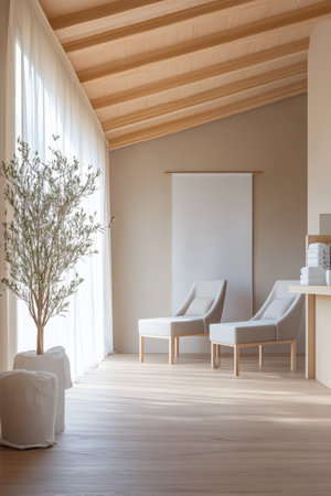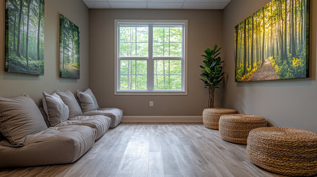 Relaxing nature-inspired lounge area with soft seating and serene forest artwork during daylight hours. Generative AI