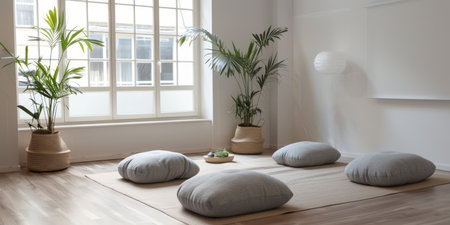 Relaxing meditation space with soft cushions and natural decor in a serene, light-filled room during daylight hours. Generative AI