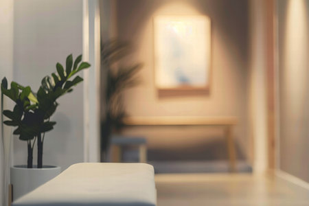 Abstract blurred view of a modern therapy room with soft warm lighting