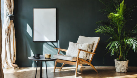 Modern living room interior with armchair, coffee table and blank poster